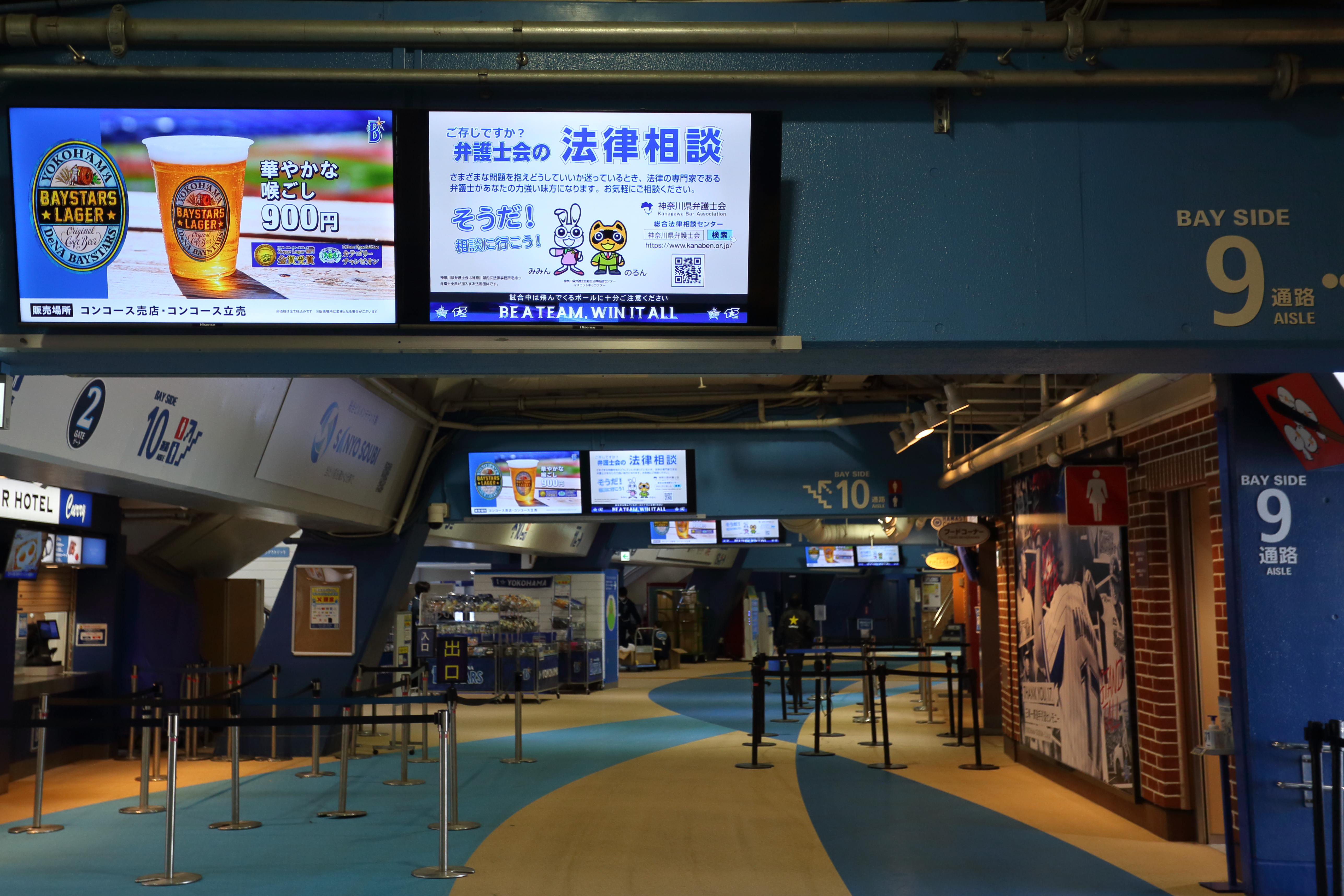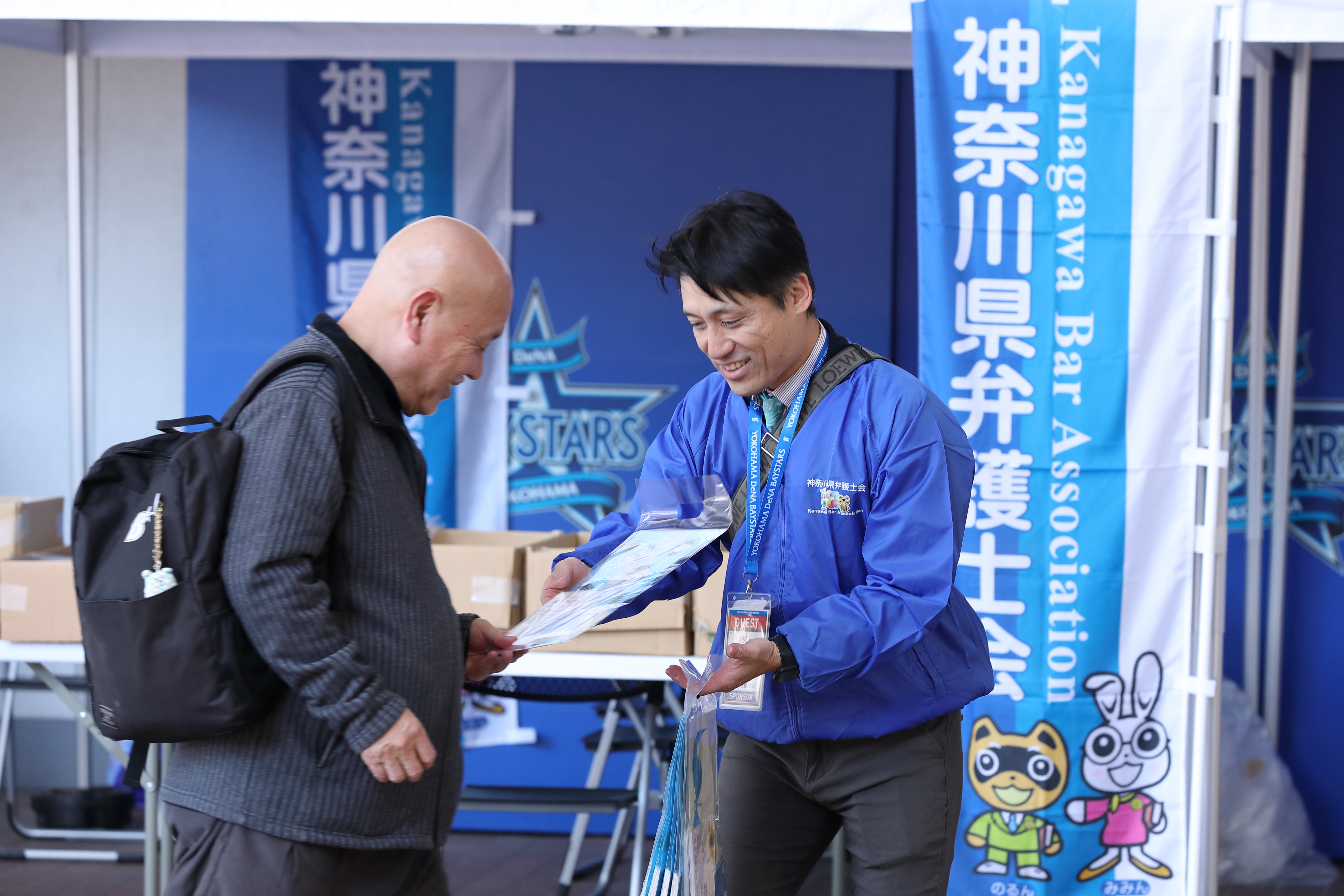 スタジアムの大型スクリーンやコンコースのデジタルサイネージ等では神奈川県弁護士会の名前が大きく掲出され、多くの来場者の皆さまに、弁護士会の存在を知っていただく貴重な機会となりました。 また、来場者の皆さまには、法律相談料が割引になるチラシを配布した他、先着50名様に当会オリジナルのトートバッグやTシャツ、先着1,000名様に当会オリジナルのメモ帳等をプレゼントしました。